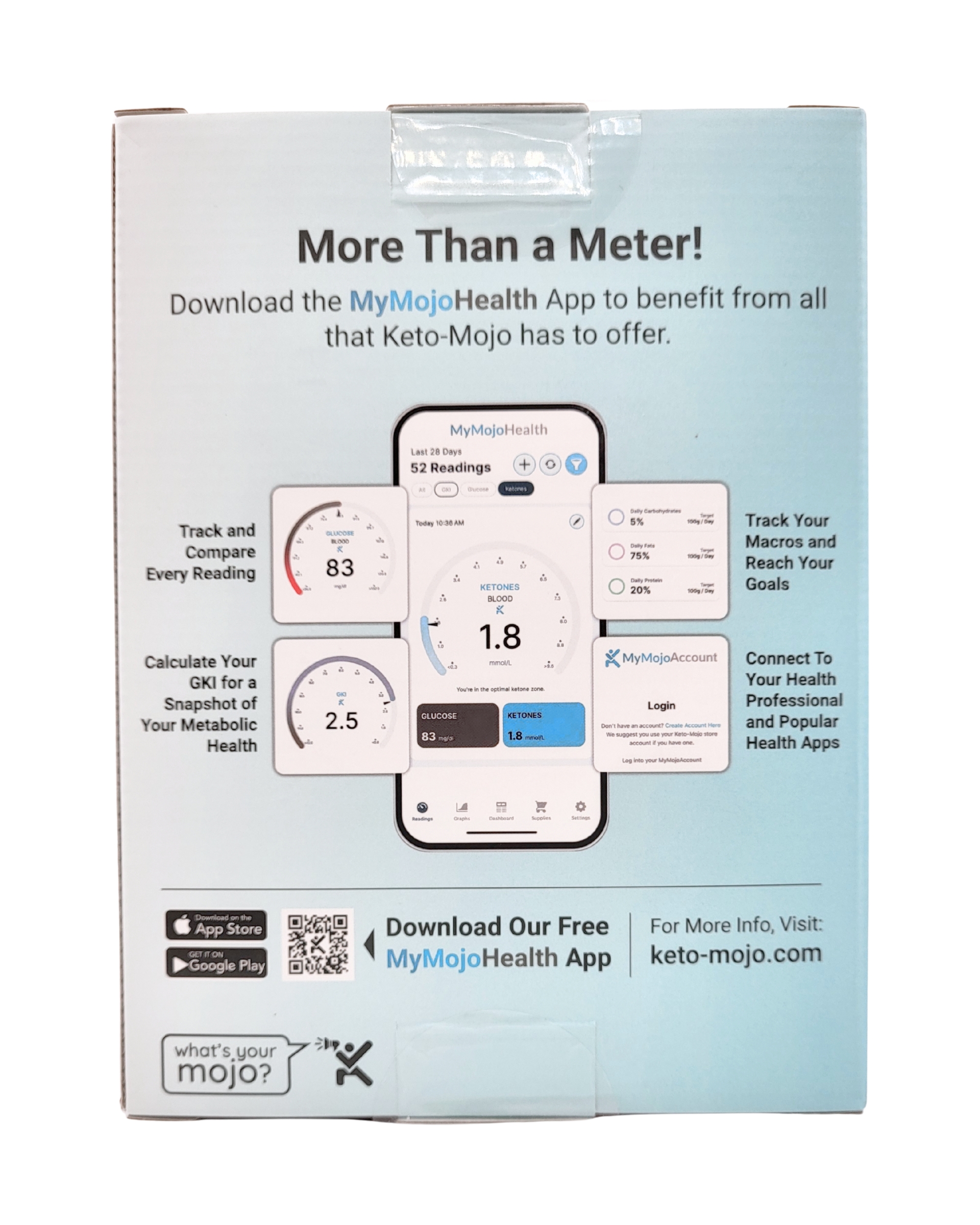 Bluetooth integration allows you to instantly download all of your glucose and ketone readings from your meter to the free Keto-Mojo App on your smartphone so you can track and monitor your progress. It’s a simple and seamless connection from your Keto-Mojo Bluetooth Meter to the app.