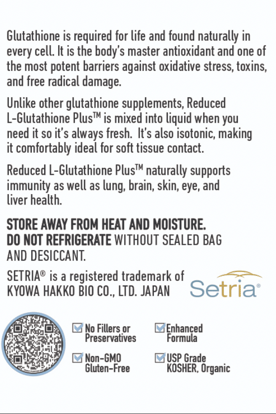 Reduced L-Glutathione Plus™ is specifically engineered for enhanced absorption and is comfortably ideal for lung, nasal, and other soft tissues. There are No fillers, excipients, preservatives, or additives in this product.